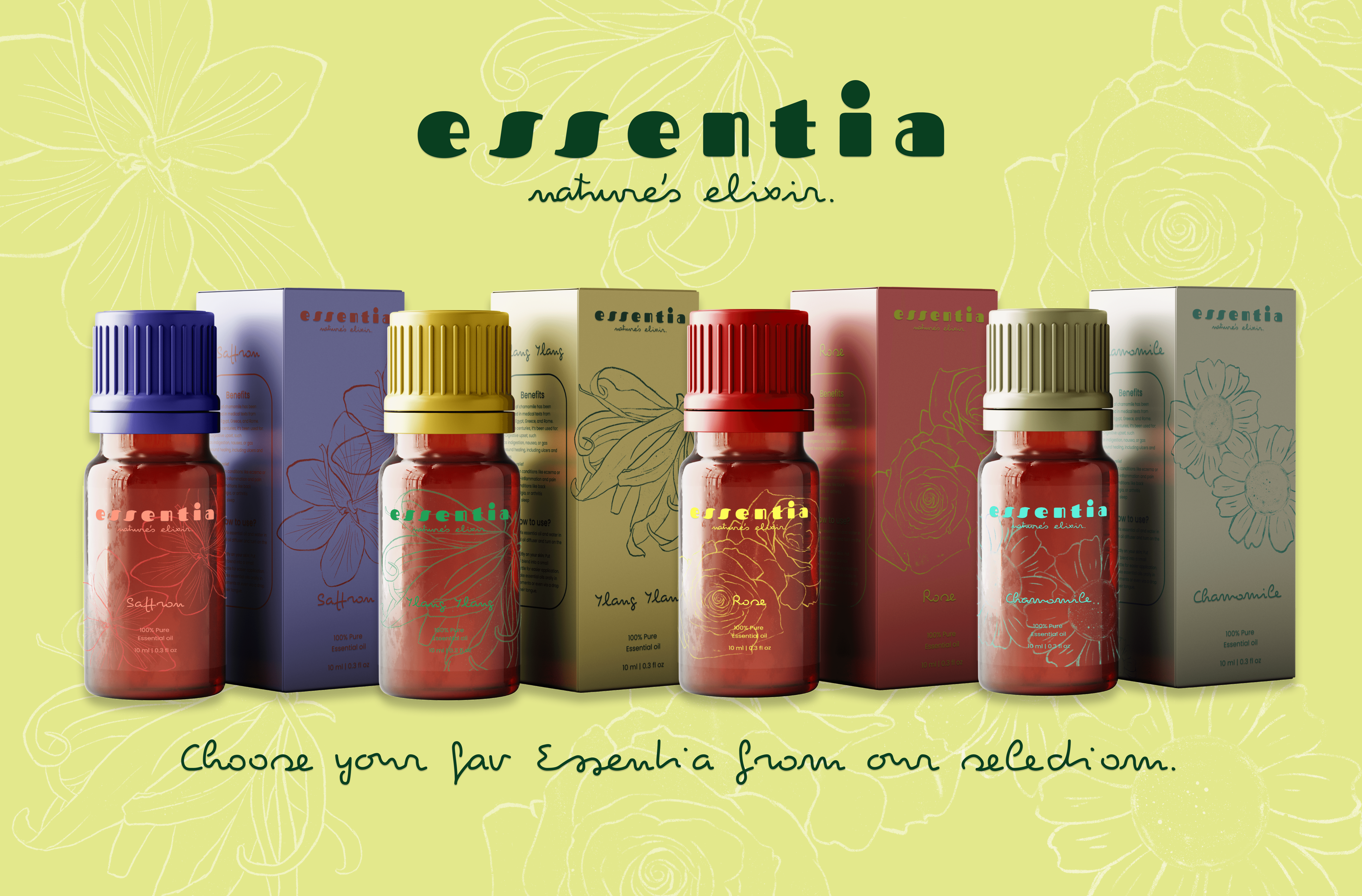 Essentia is a new floral essential oil line focused on distributing new herbs with their many benefits with its colorful brand colors and striking visuals its aim to target the youth. Essentia comes from the Latin word essence, which reflects the product’s purpose. The brand colors are bright and cohesive, reflecting the beauty of flowers and capturing the eyes of a youthful audience.