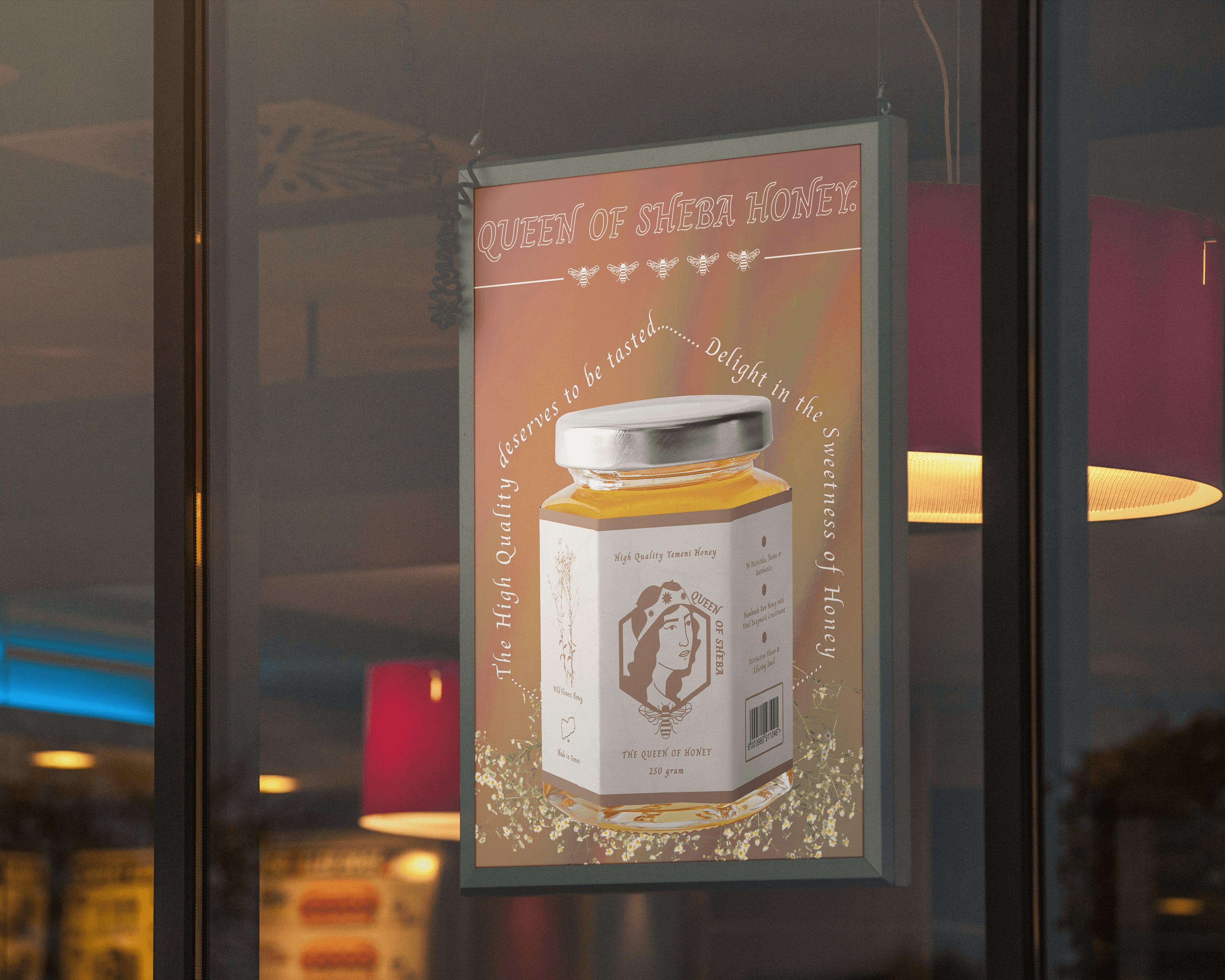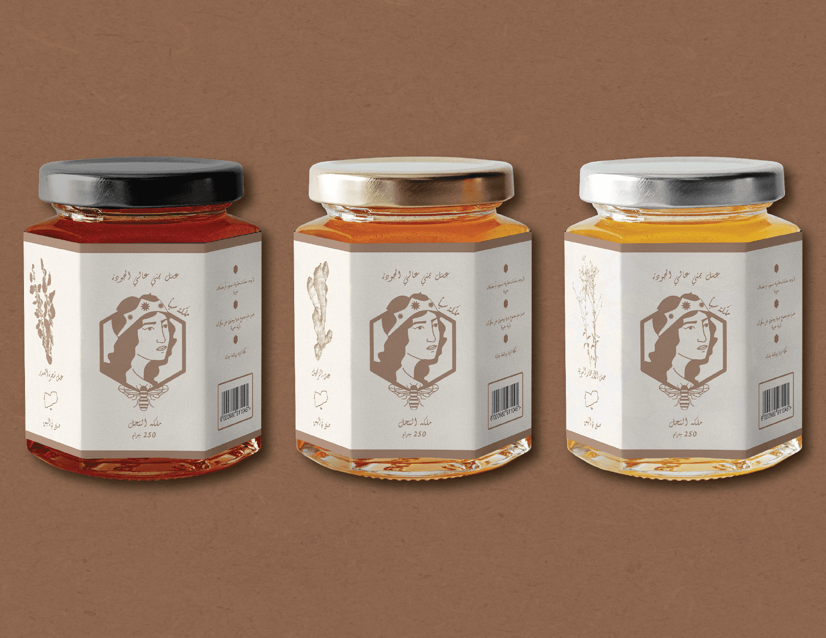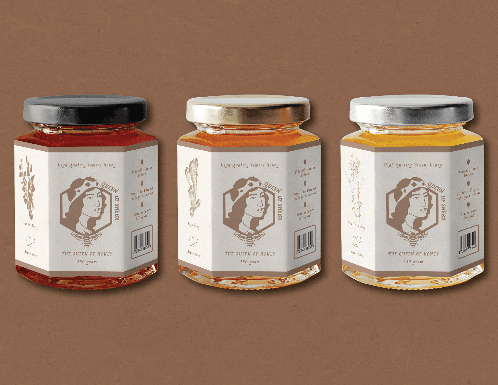 Named after one of Yemen's prominent queens, dating back to the 10th century BCE. Queen of Sheba Honey introduces variety of flavoured from ingredients native to the land. Handmade raw honey with vital enzymatic constituent, distinctive flavor, and alluring smell. The illustrated logo is inspired by the design of the Alphonse Mucha characters, used to invoke a royal and regal touch.
